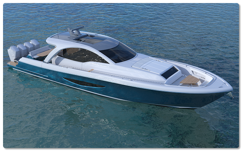 The express-style fishboat has a Michael Peters-designed running surface and four 600-hp Mercury V12 Verado outboards.