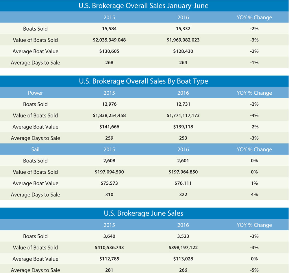 According to YachtWorld member brokers reporting in SoldBoats, their proprietary database, 15,332 boats in the United States sold for $1.97 billion. During the same period in 2015, 15,584 boats sold for $2.04 billion.