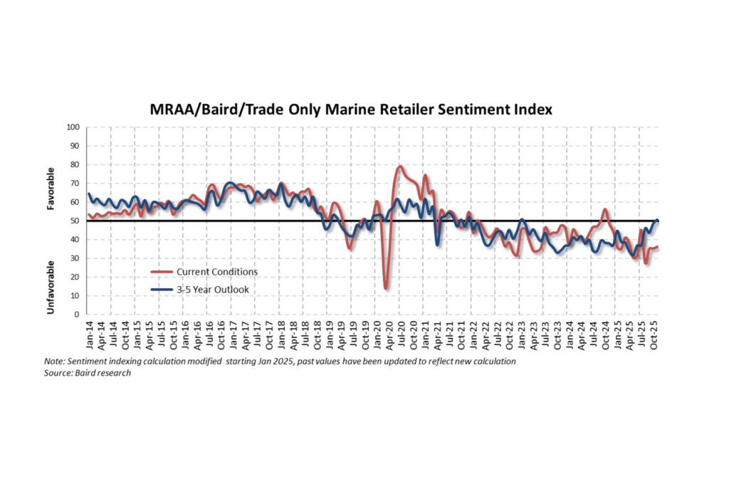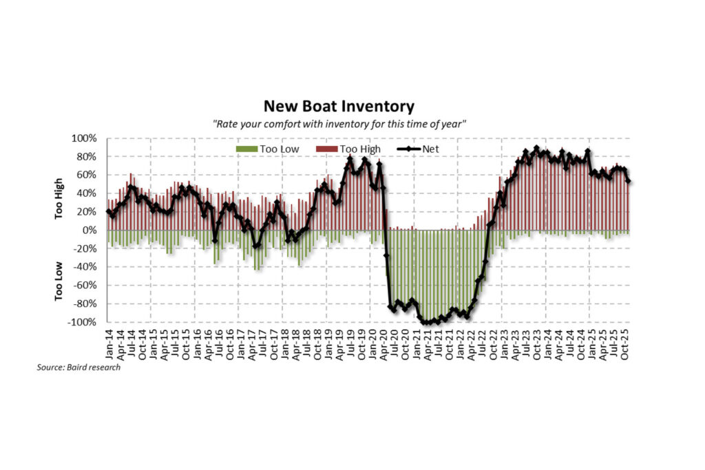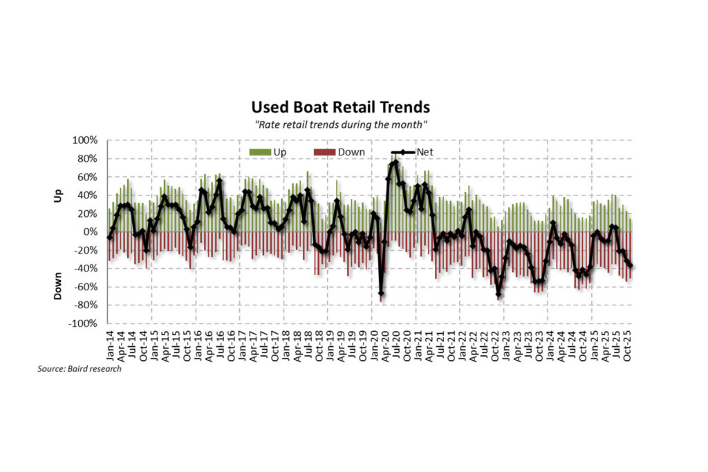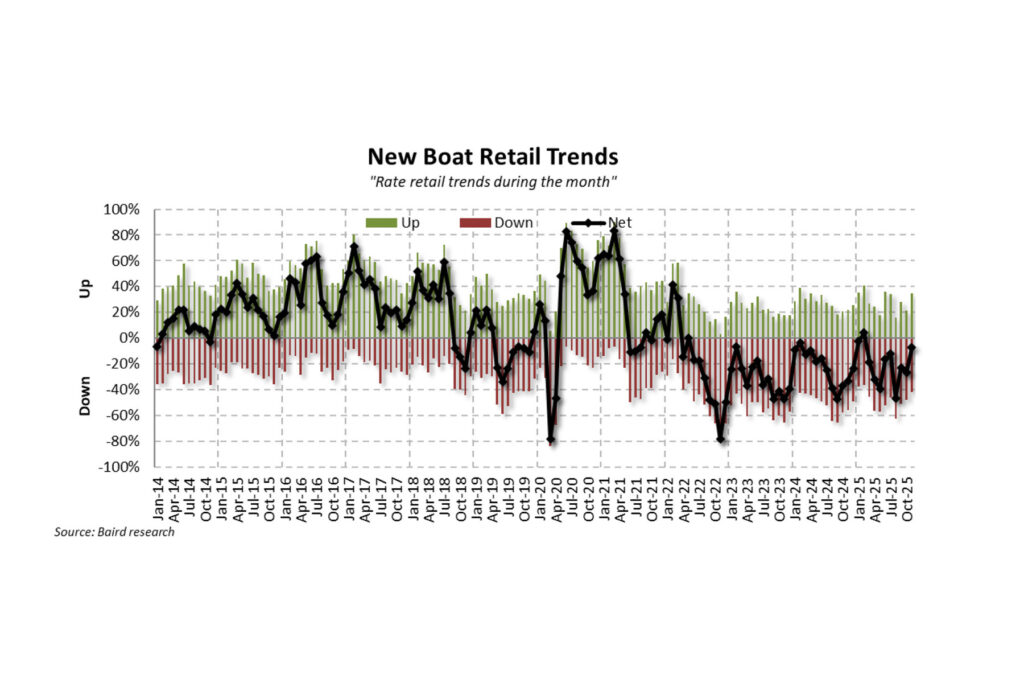 Overall, Baird’s November data suggests “less bad” trends. The research firm sees evidence that dealers — and the broader marine industry — remain focused on managing channel inventory and positioning for the 2026 season, including early boat shows. “Big picture,” Baird noted, “we see reasons to be optimistic — lower interest rates, less tariff noise and better tax refunds — but acknowledge downside tied to affordability headwinds, employment anxiety, credit instability and policy wildcards.”