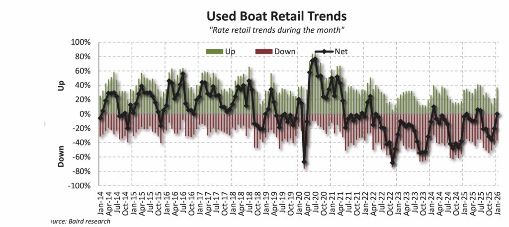 For this month’s Pulse Report, Soundings Trade Only, Baird Research and the Marine Retailers Association of the Americas asked 50 retailers to assess recent trends in North America. In January, 40% of dealers surveyed reported retail declines, compared with 32% that reported growth. Dealers also reported flattish used-boat retail, as 37% reported declines and 37% reported growth.