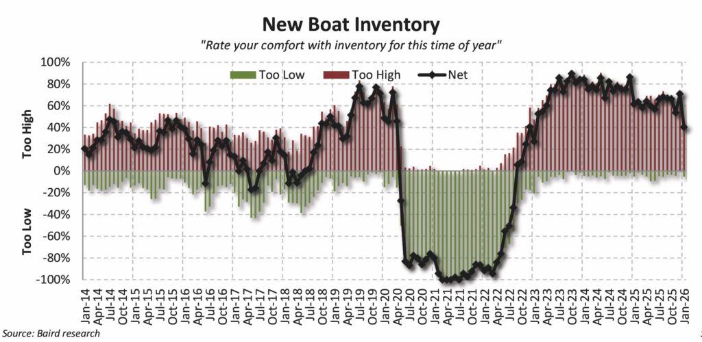 Dealer assessment of inventory levels improved, as 46% reported new-boat inventory is “too high,” down from 71% in December. Five percent of dealers considered new-boat inventory “too low,” up from none in December. During winter, dealers seek to minimize carrying costs, and financiers have suggested that dealer inventory comfort will improve this spring as the retail selling season starts up. For used inventory, 30% reported “too low” versus 28% that reported “too high.”